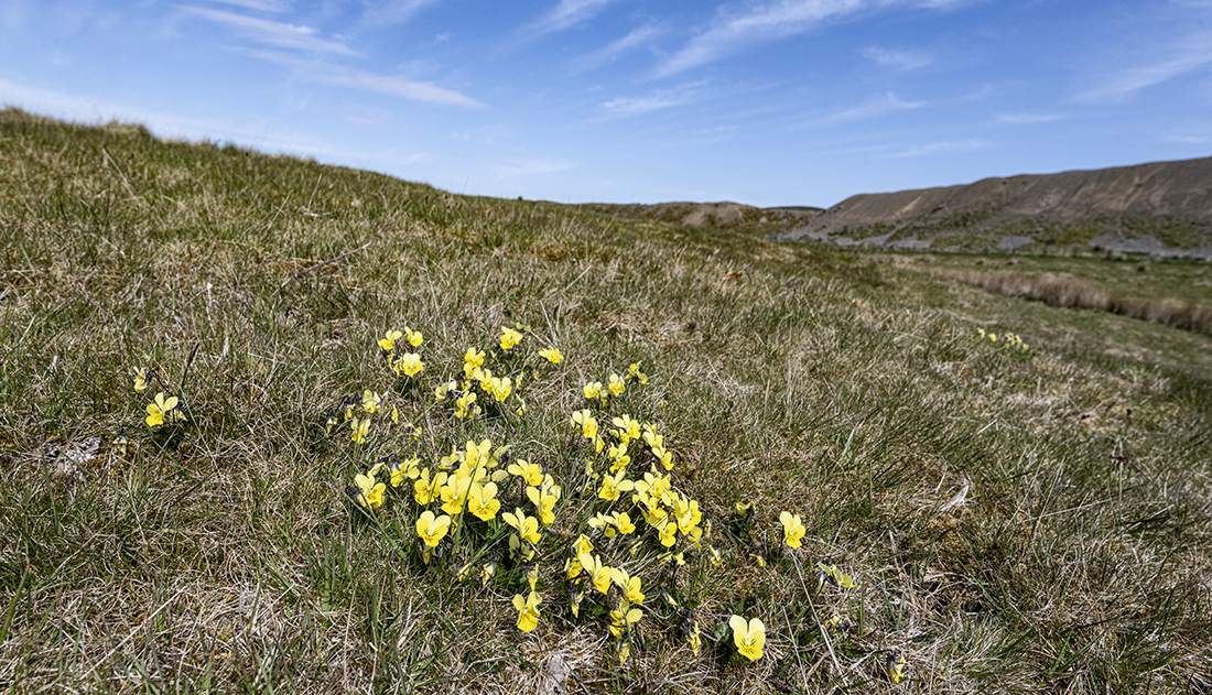 Calaminarian grassland describes a habitat of typically short turf in the vicinity of historic lead mining sites and supports a characteristic flora. This includes Mountain Pansy, Viola lutea, shown in the photograph, Wild Thyme, Sheep's Fescue, Harebell, Alpine Pennycress and Ribwort Plantain.
