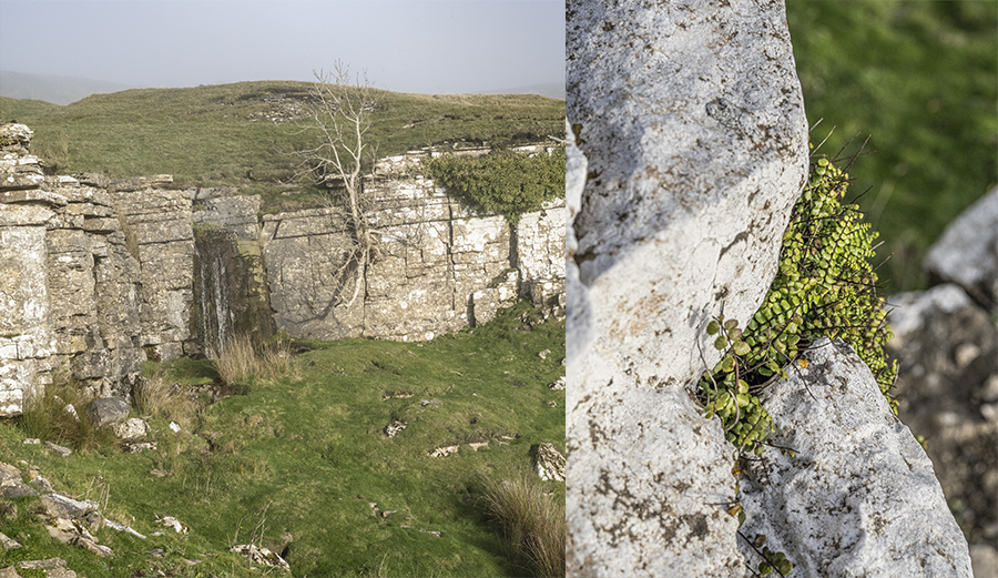 Redmire Scar is a long, low outcrop of limestone in the northern part of the parish and effectively separates the moorland from the farmland. The illustration here shows a small waterfall, where Barney Beck crosses the scar, and detail of Maidenhair Spleenwort (Asplenium trichomanes), a small fern. The whiteness of the limestone is increased by a covering of the lichen Aspicilia calcarea. The scar also provides a habitat for Ash (Fraxinus excelsior) in the cracks and Ivy (Hedera helix), both visible to the right of the waterfall.