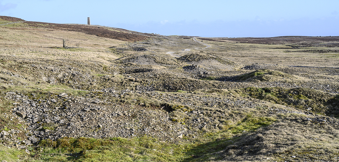 The photograph above shows part of Cobscar Rake. The lead vein is traced out by the line of spoil heaps, resulting from the exploitation of the vein. The vertical structure, closest on the left, is the north wall of the Calamine House. The chimney on the horizon belongs to Cobscar Mill. A stone track follows the rake, giving access to the moor, which is now used for sheep grazing and grouse shooting. Left in the picture is north and right is south. Some considerable churning of rocks has taken place, so rocks from underground now lie on the surface. Galena, lead ore, can still be found in the spoil.